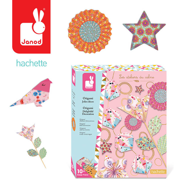 Zestaw kreatywny do tworzenia origami francuskiej marki JANOD zawiera 70 kwadratowych arkuszy ozdobnego papieru w kwiatowe i graficzne wzory, 3-metrowy sznurek, 10 metalowych koralików i 2 cienkie drewniane patyczki. Załączona instrukcja pozwala na stworzenie m.in. girlandy z przestrzennymi elementami, papierowego kwiatka i parasolki, ptaszka i innych figur. Po skończonej pracy dzieła dziecka mogą mu jeszcze długo służyć jako ozdoby lub podarunki dla bliskich.