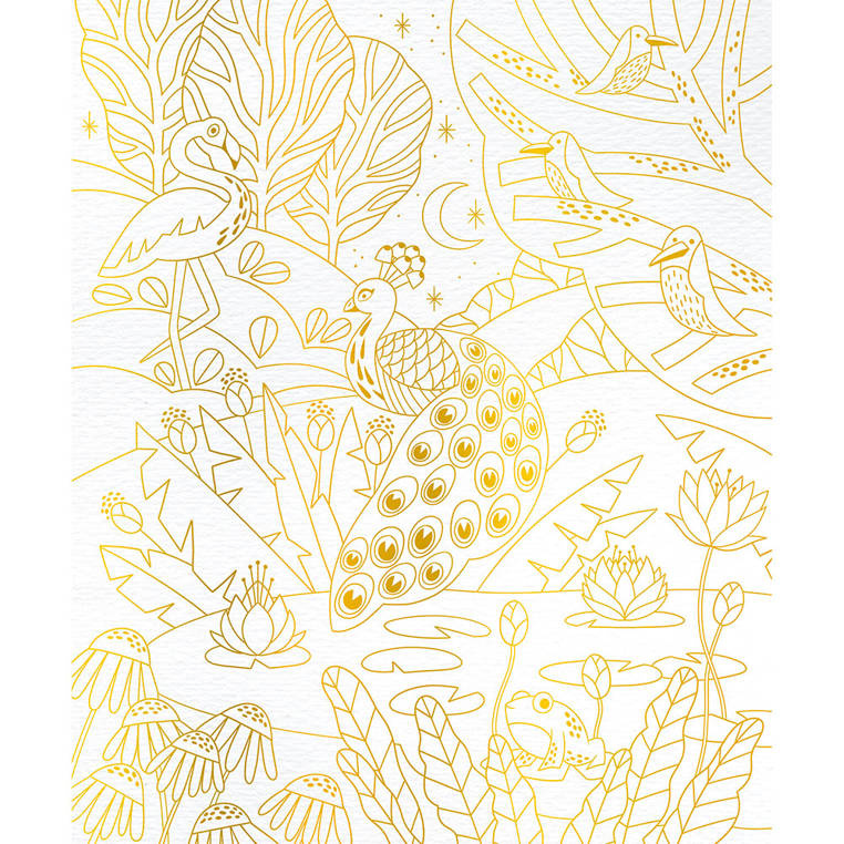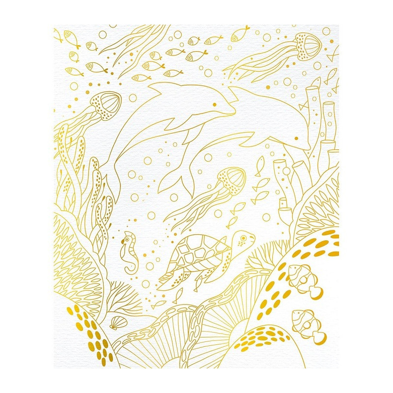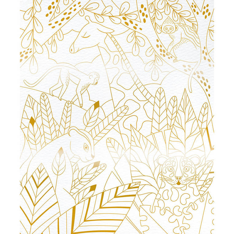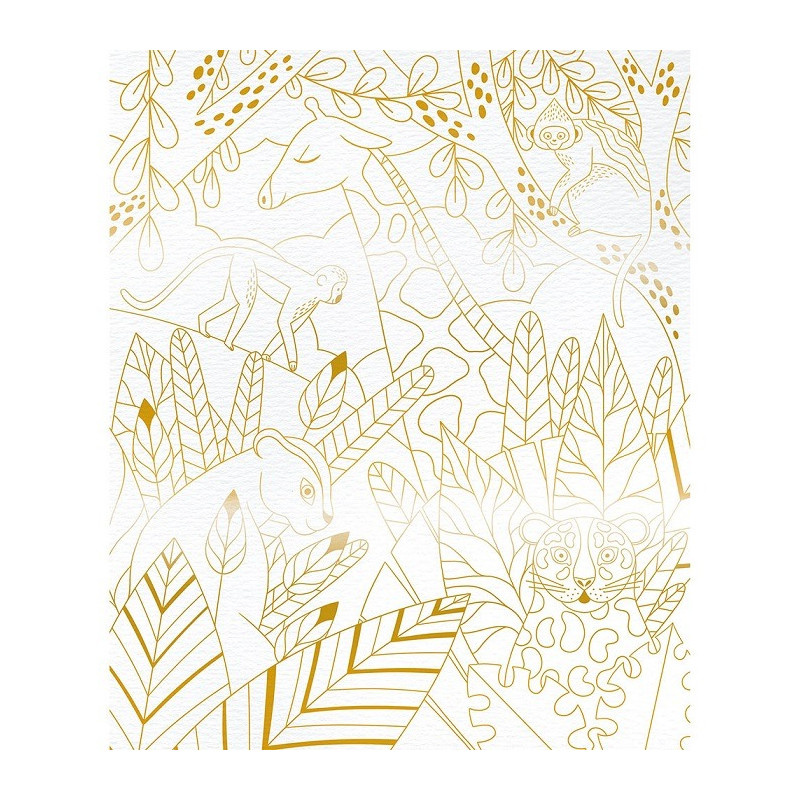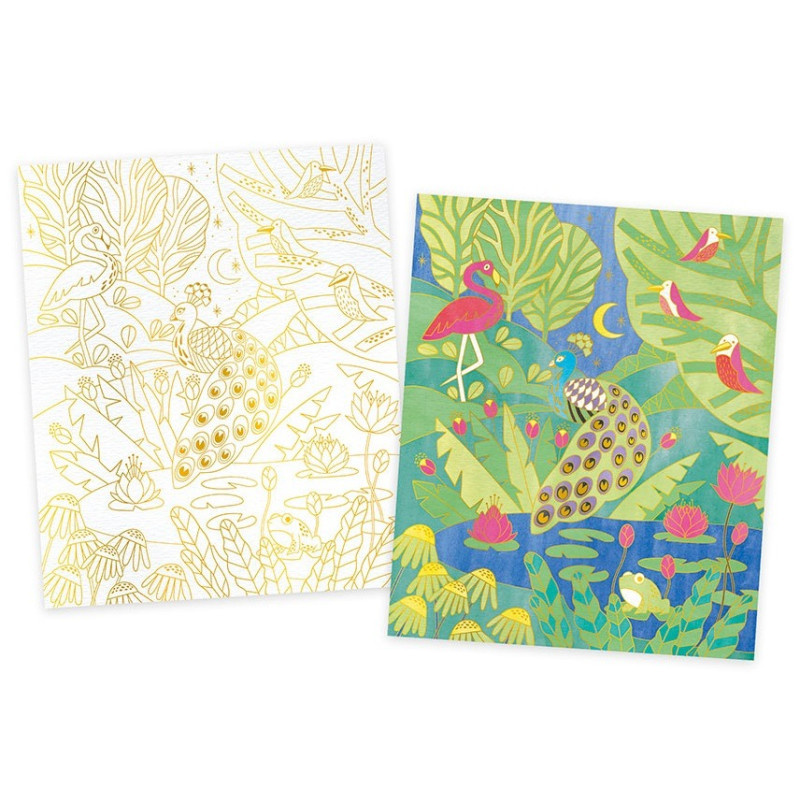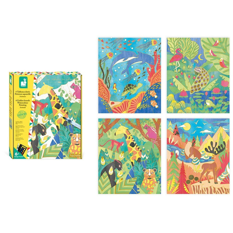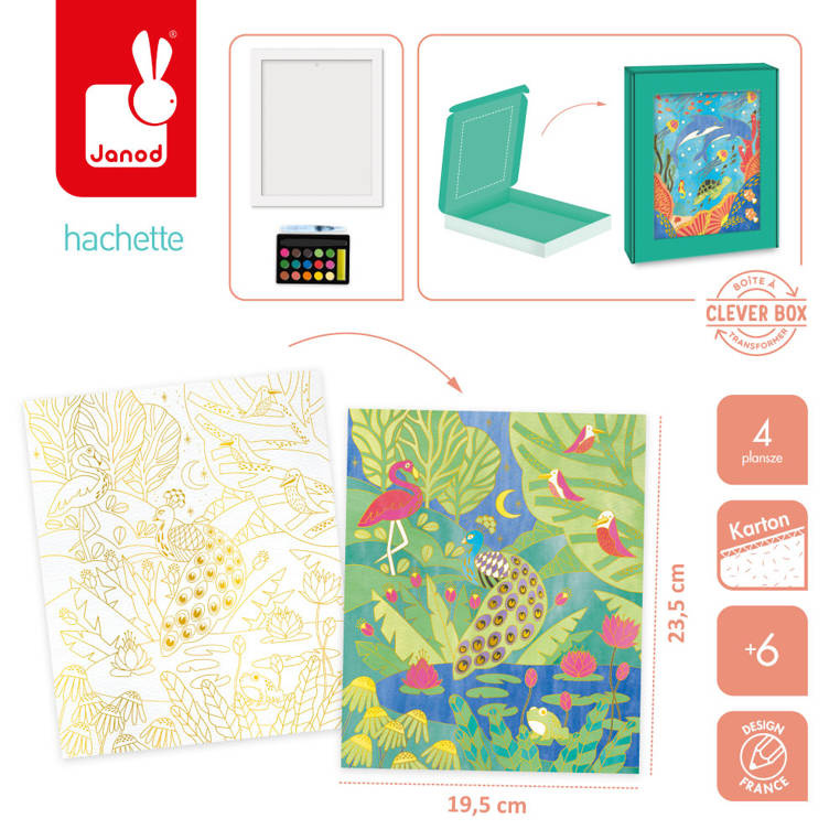 Zestaw kreatywny Złote kontury Zwierzęta francuskiej marki JANOD zawiera 4 plansze-obrazki z przedstawicielami różnych gatunków zwierząt: wodnych, egzotycznych, z gór i z dżungli. Na białych planszach widoczne są wyraźne, nieco wypukłe złote kontury wszystkich elementów obrazka. Zadanie polega na precyzyjnym – za pomocą dołączonego specjalnego cienkiego pędzelka ze zbiornikiem wody – wypełnieniu przestrzeni farbą, zgodnie z instrukcją (kontury zapobiegają miksowaniu się kolorów i ułatwiają estetyczne wykonanie pracy). W palecie akwareli znajduje się 15 kolorów i mała gąbka do pochłaniania nadmiaru wody. Sprytne opakowanie może stać się ramką na skończone dzieło. Malowanie farbami to dla dziecka godziny angażującej i jednocześnie uspokajającej, wyciszającej zabawy, a gotowe obrazki staną się wspaniałą dekoracją dziecięcego pokoju.
