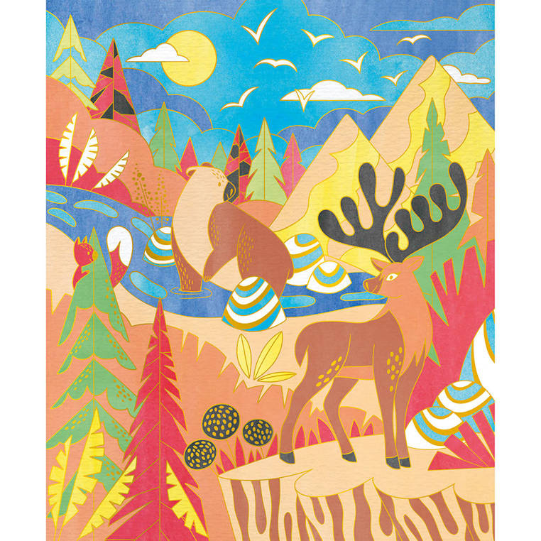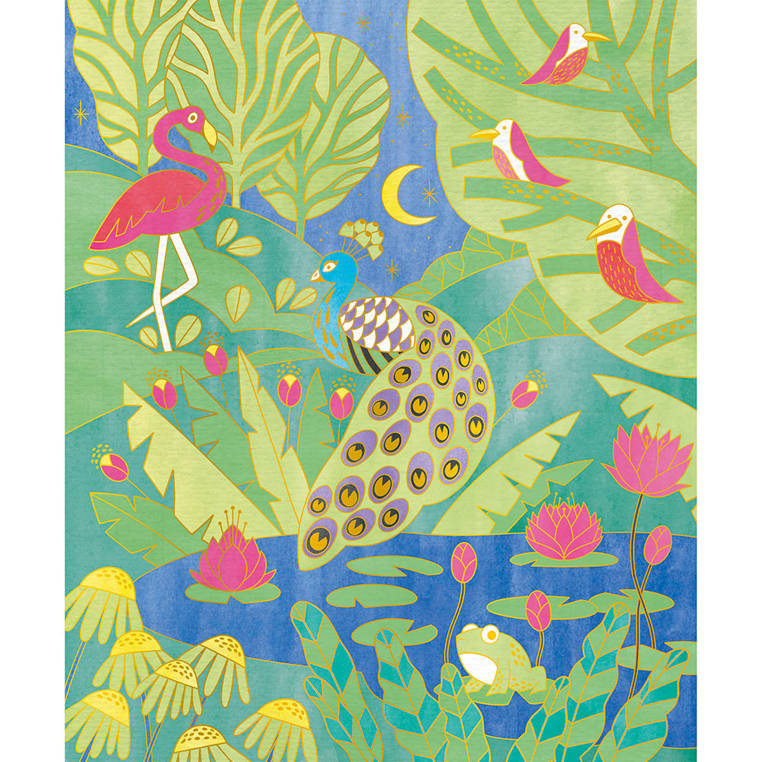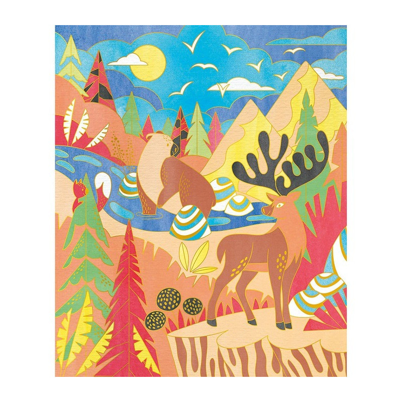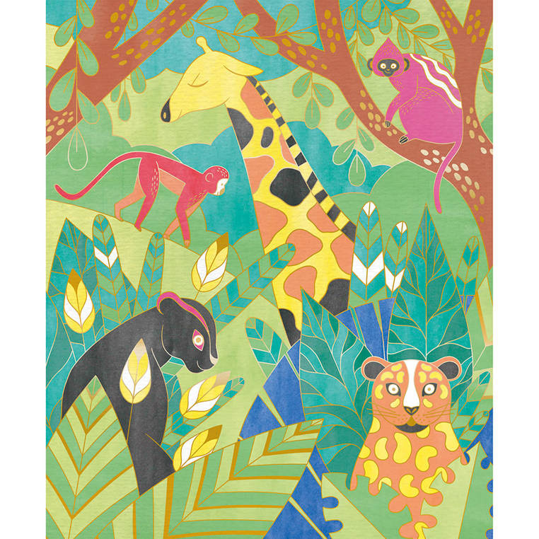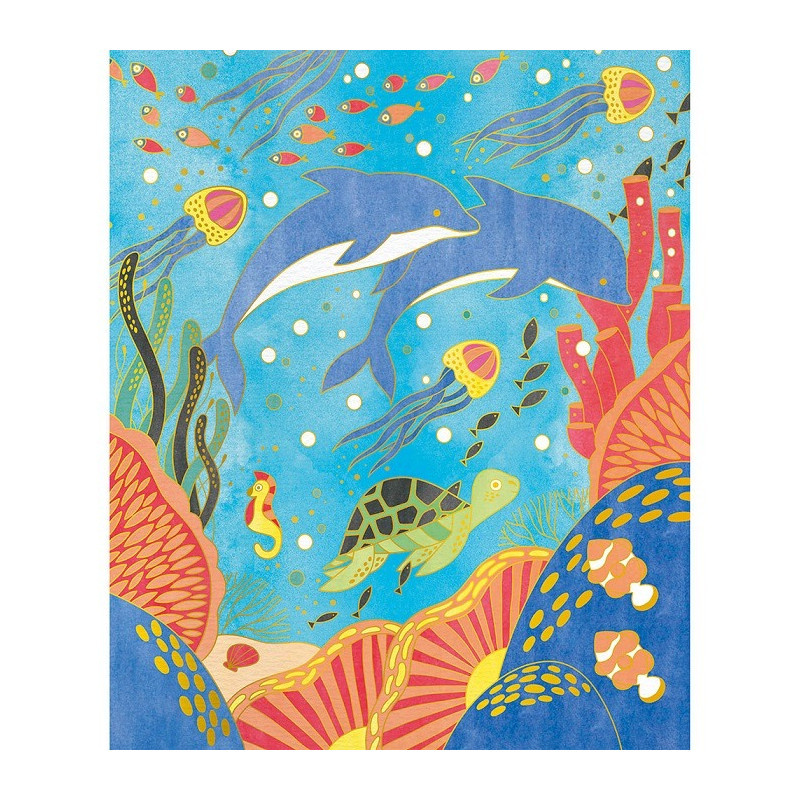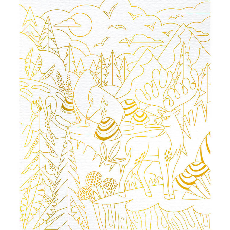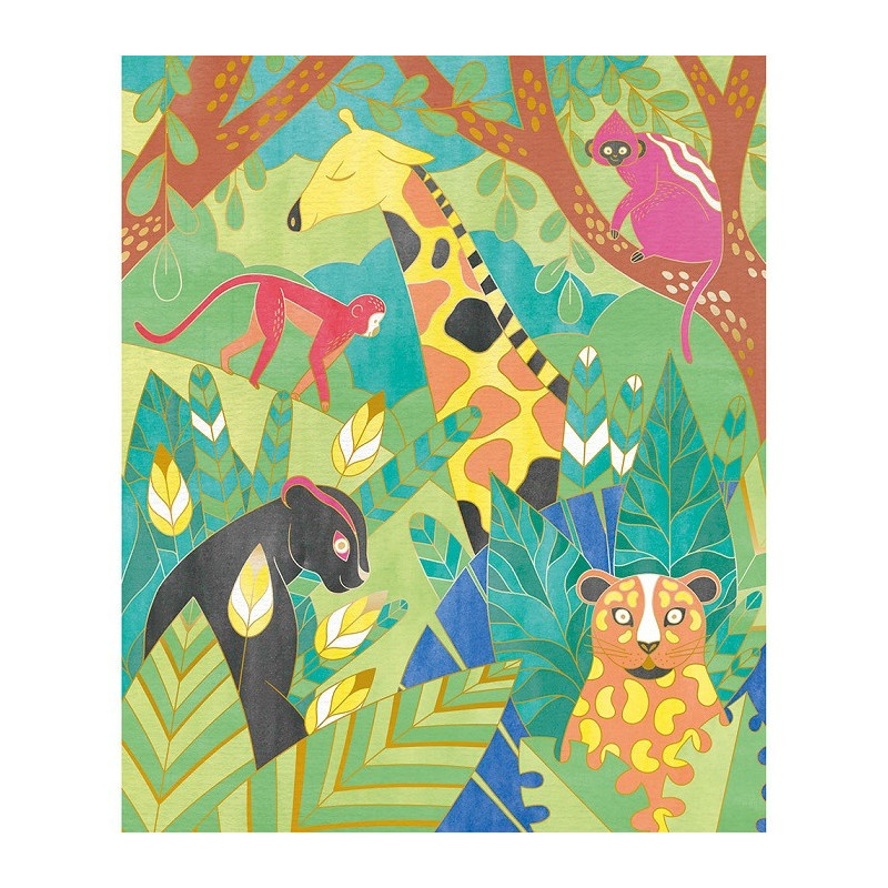 Zestaw kreatywny Złote kontury Zwierzęta francuskiej marki JANOD zawiera 4 plansze-obrazki z przedstawicielami różnych gatunków zwierząt: wodnych, egzotycznych, z gór i z dżungli. Na białych planszach widoczne są wyraźne, nieco wypukłe złote kontury wszystkich elementów obrazka. Zadanie polega na precyzyjnym – za pomocą dołączonego specjalnego cienkiego pędzelka ze zbiornikiem wody – wypełnieniu przestrzeni farbą, zgodnie z instrukcją (kontury zapobiegają miksowaniu się kolorów i ułatwiają estetyczne wykonanie pracy). W palecie akwareli znajduje się 15 kolorów i mała gąbka do pochłaniania nadmiaru wody. Sprytne opakowanie może stać się ramką na skończone dzieło. Malowanie farbami to dla dziecka godziny angażującej i jednocześnie uspokajającej, wyciszającej zabawy, a gotowe obrazki staną się wspaniałą dekoracją dziecięcego pokoju.
