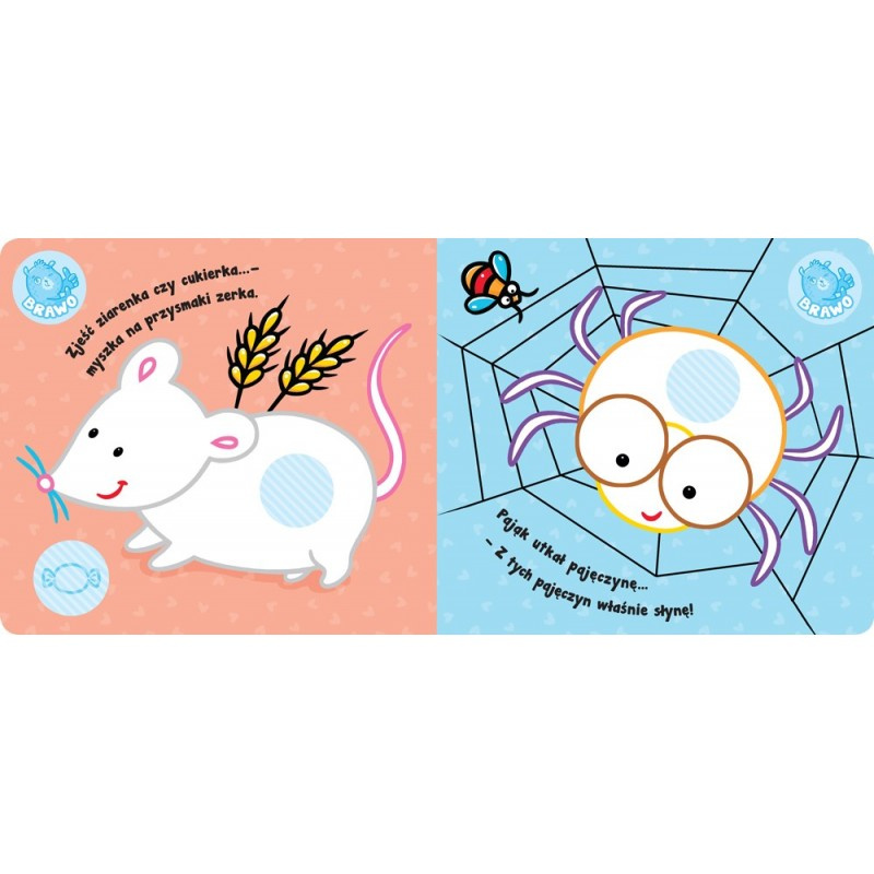 - Kolorowanka rozwijająca motorykę i kreatywność. Duże naklejki, grube kontury i wierszyki uczą nazw zwierząt i kolorów przez zabawę.